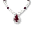 The Scarlet Necklace exudes vintage charm with a radiant ruby and diamond pendant, elegantly suspended on a pearl chain adorned with delicate ruby baubles.