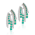 These captivating earrings feature cascading rows of vivid Zambian emeralds and brilliant diamonds, gracefully arranged to evoke the elegance of hanging chandeliers. The bold silhouette and vibrant green accents make them a luxurious statement piece.