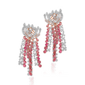 These stunning shoulder dusters feature cascading strands of pink tourmalines and dazzling diamonds, mimicking the delicate rhythm of falling raindrops. The fluid design exudes elegance and grace, making them a perfect statement of refined femininity.
